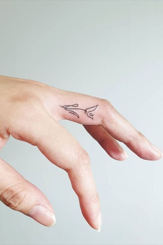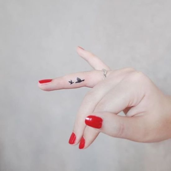 - Populaire vrouwelijke tattoo's op de vingers zijn afbeeldingen van een minimalistische zwaluw. Deze symboliseert vrijheid, verlangen en liefde voor de zee. Volgens oude legendes vertegenwoordigt deze vogel de zielen van mensen die hun leven aan de oceaan hebben gegeven. De afbeeldingen met een zwaluw zien er elegant en bescheiden uit. Deze kunnen gemakkelijk worden aangepast en geschaald aan de grootte en vorm van de vinger.