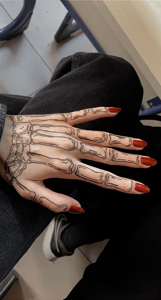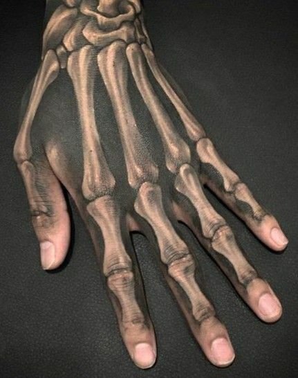- Onder de populaire mannelijke tattoo's op de vingers is er het idee van de schematische afbeelding van de botten van de vingers die overeenkomen met de echte anatomie. Dergelijke werken zien er geweldig en indrukwekkend uit. Het verwijst naar een dergelijk absoluut als de dood. Het skelet kan ook dienen als een herinnering dat alles vroeg of laat eindigt, en het leven is een cyclisch fenomeen.