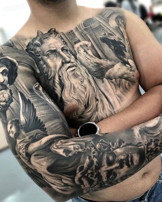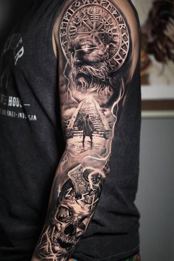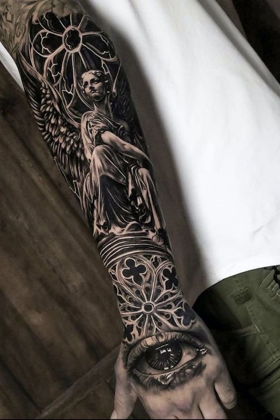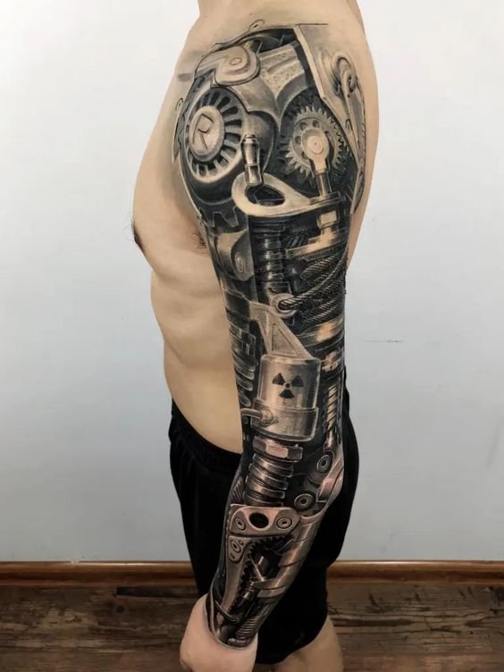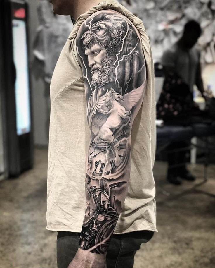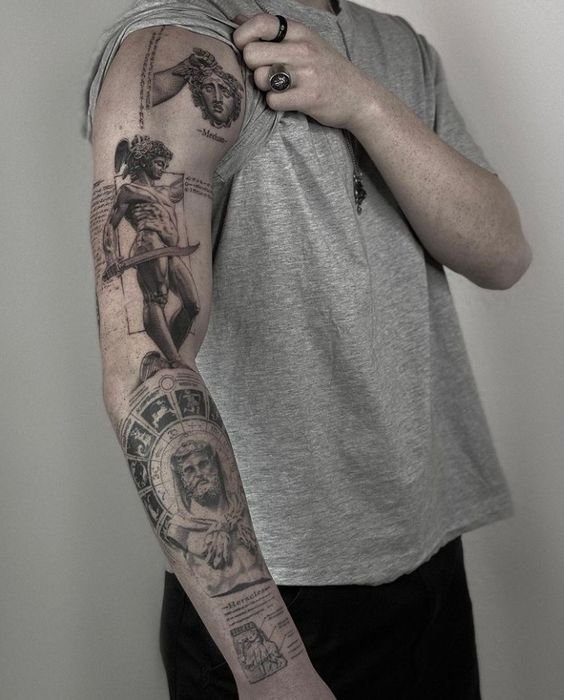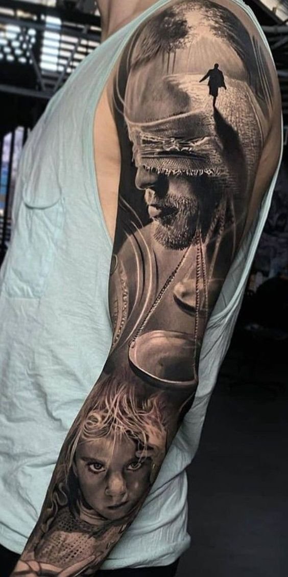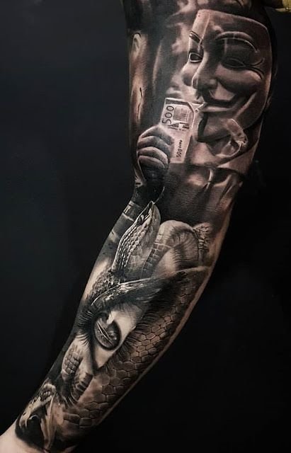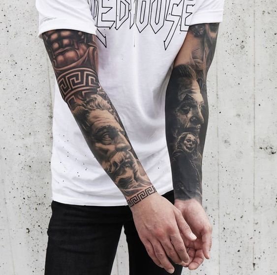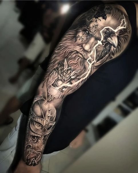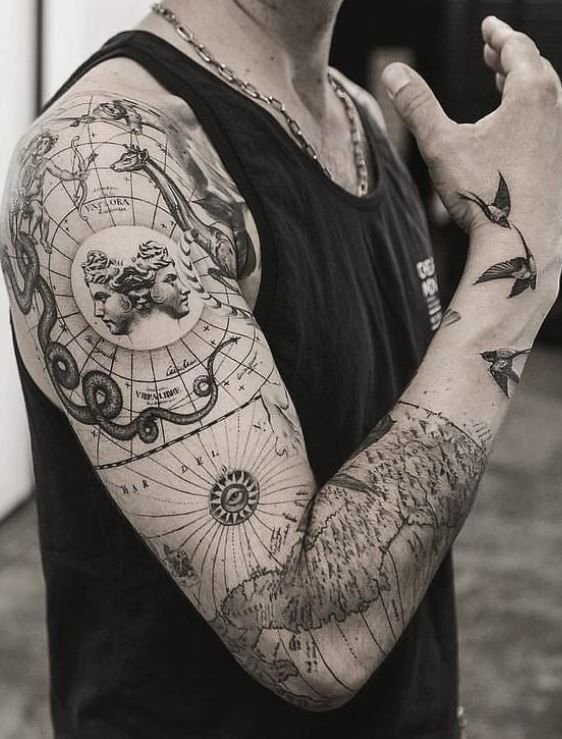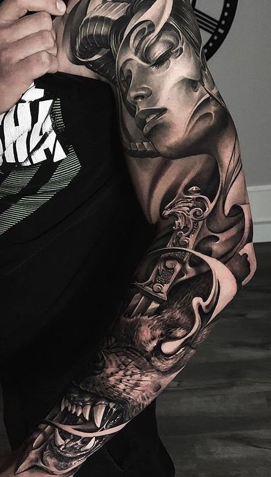 The design of a men's tattoo on the whole arm needs to be well designed right from the beginning, because then it would be difficult to connect two different designs, organically connect the lines. To do this, you can use ready-made photos from the site or develop an individual sketch with the artist. The main rule here is the integrity and uniform style of the tattoo.