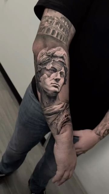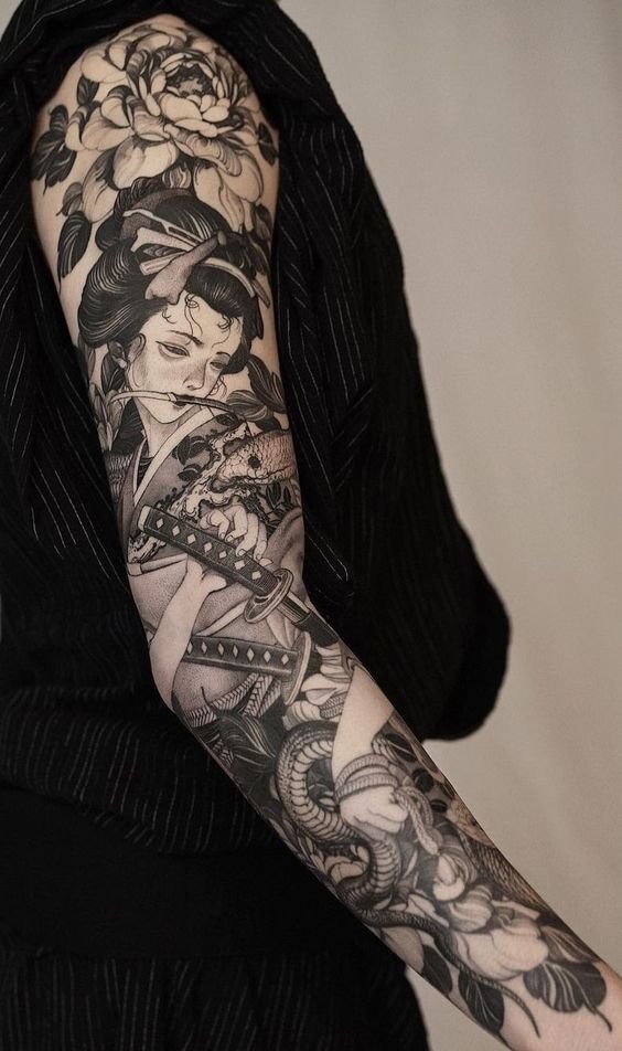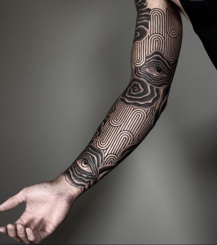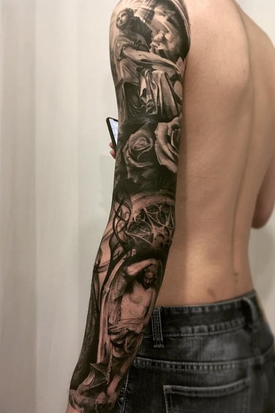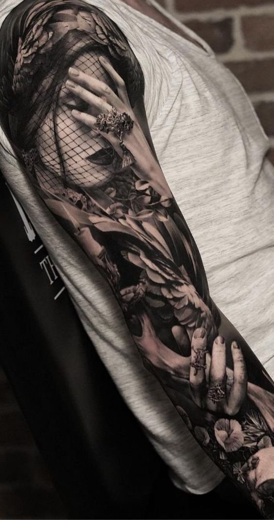 The feature of the sleeve tattoo on the whole arm is a holistic pattern from the shoulder to the wrist.