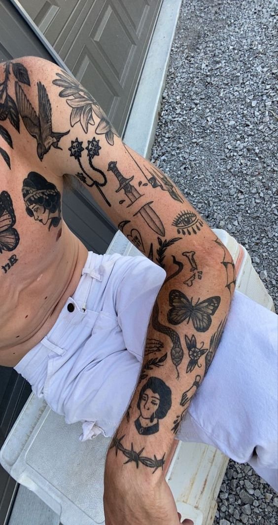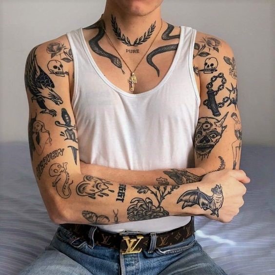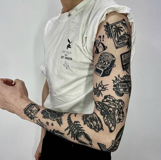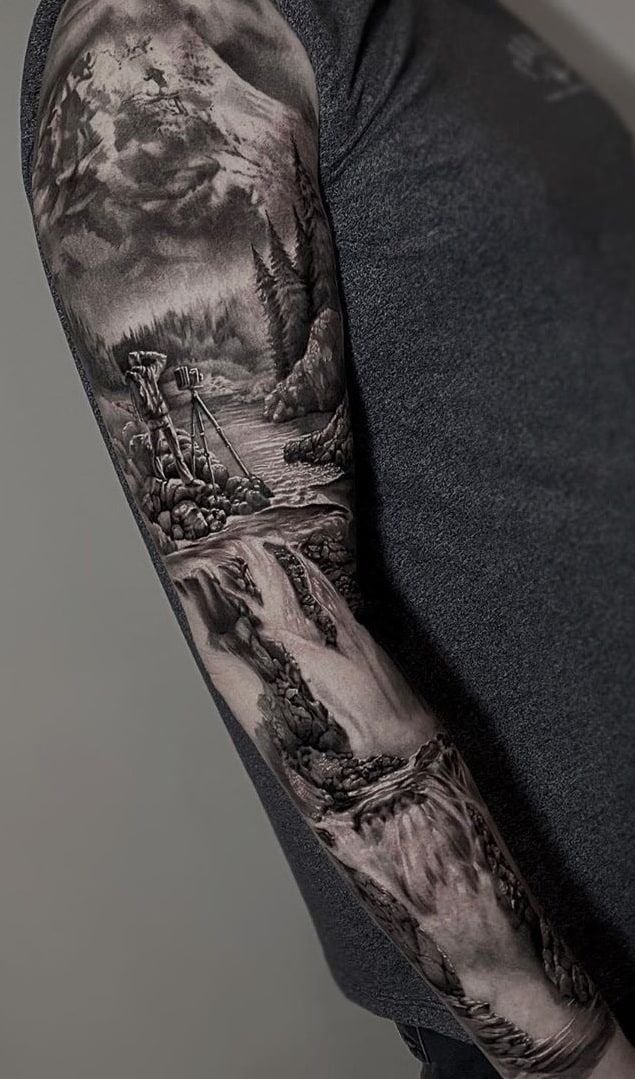 The first is one large tattoo on the whole arm. The second is a lot of small drawings, which should be united by the theme and style creating a single plot. To make such project, men must take into account several features: time, design and professionalism of artist.
