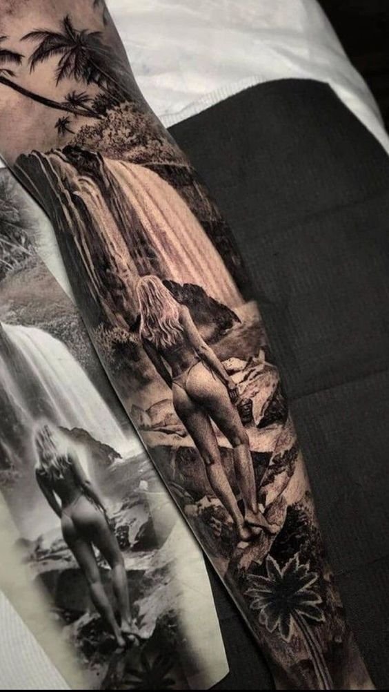 Their choice depends on the preference of the client. Modern men most often ink drawings in the style of realism or, as they also call it, biomechanics. In such tattoos, you can see the image of both animals and the faces of girls. Their peculiarity is that they are copied from a photograph.