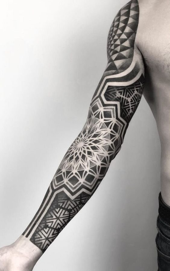 Another style that has not lost popularity over the years is geometry. In the tattoo sleeve, rhombuses, squares and triangles add up to a composition with meaning. Such simple figures can be depicted both in abstract forms and in quite organic ones - drawings of animals or plants.