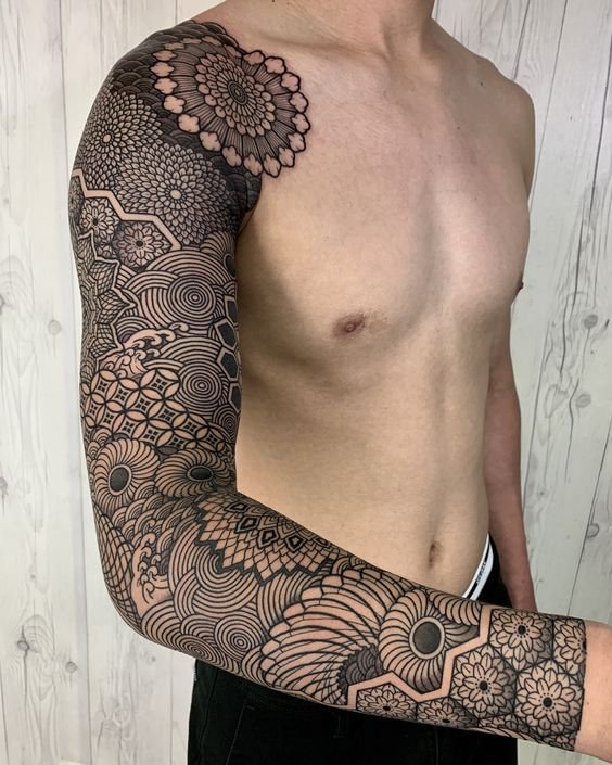 The male tattoo sleeve covers the entire arm with a pattern and creates the effect of a real fabric sleeve with a pattern.