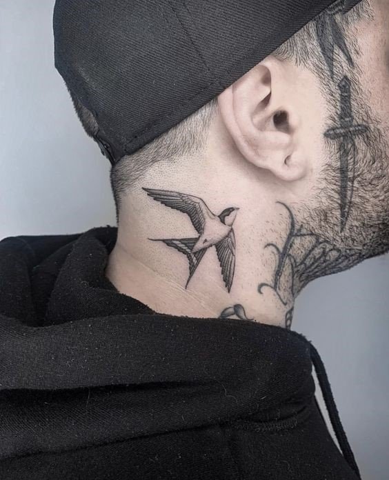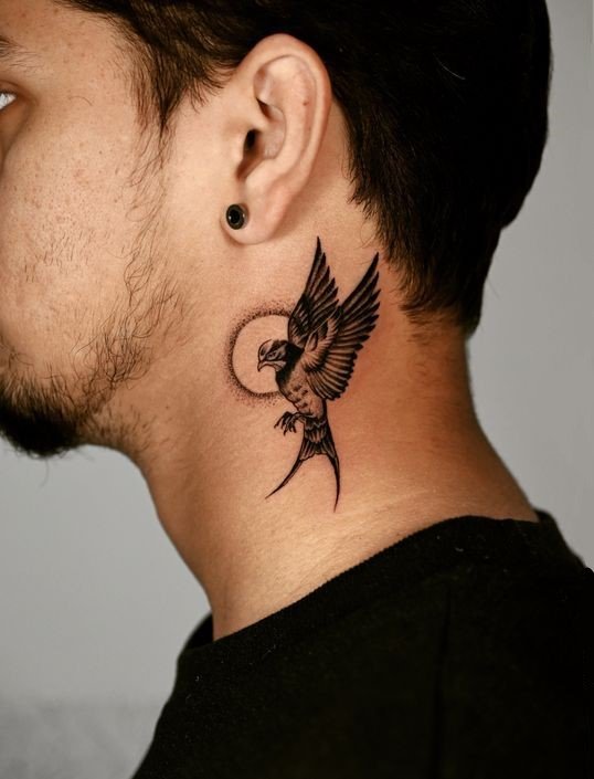 Neck tattoos for men often depict proud and immediate birds.