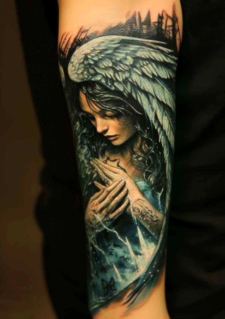 It is believed that the guardian angel is behind the right shoulder of each person. Tattoos are often done on the back or chest. The body image of an angel is often present in the variation of a large-scale composition, for example, sleeves.