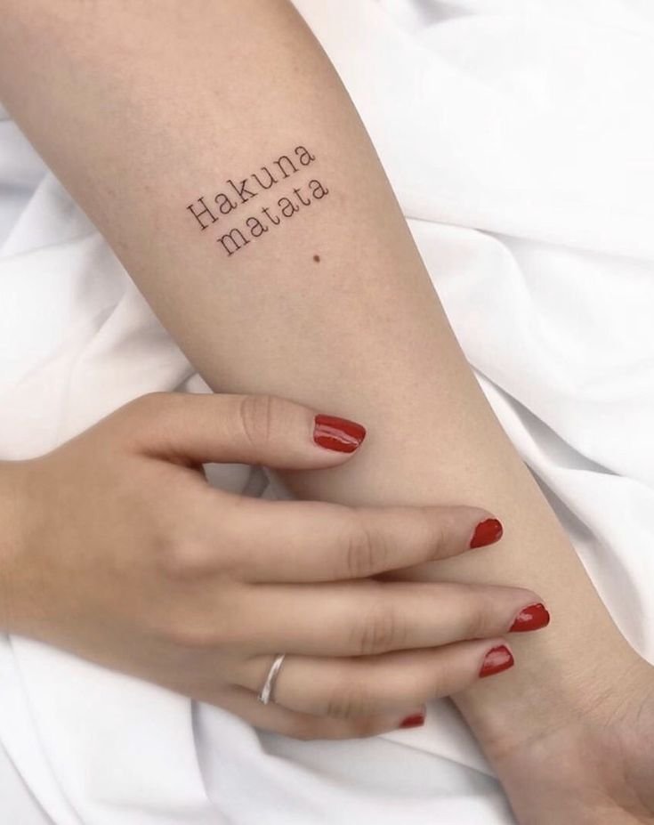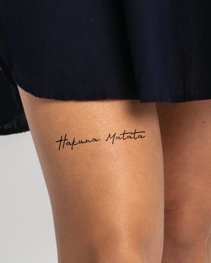 - “Hakuna Matata” is a philosophy of acceptance, the ability to embrace what can’t be changed, and find inner peace. A tattoo with this expression reminds us that sometimes we simply need to accept life as it is and enjoy each moment. It’s ideal for those who seek inner harmony and balance.
