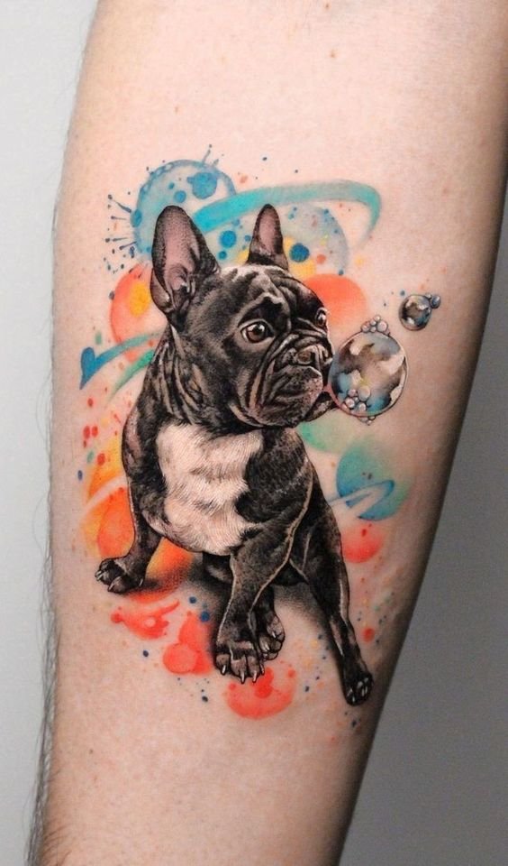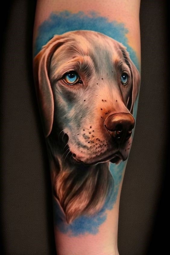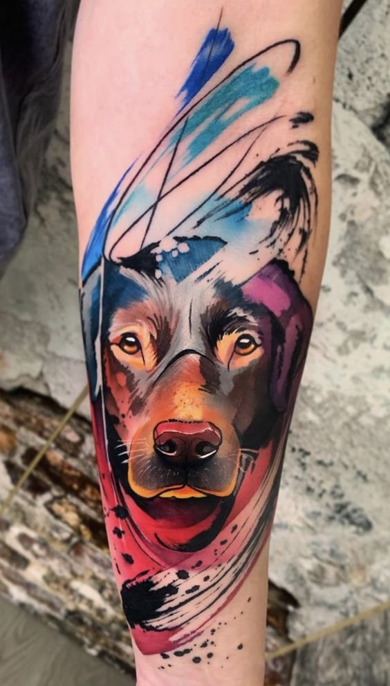 - Watercolor dog: Add vibrancy and color to your design with the watercolor style. Soft color transitions and blurred edges give the tattoo a light and artistic look.