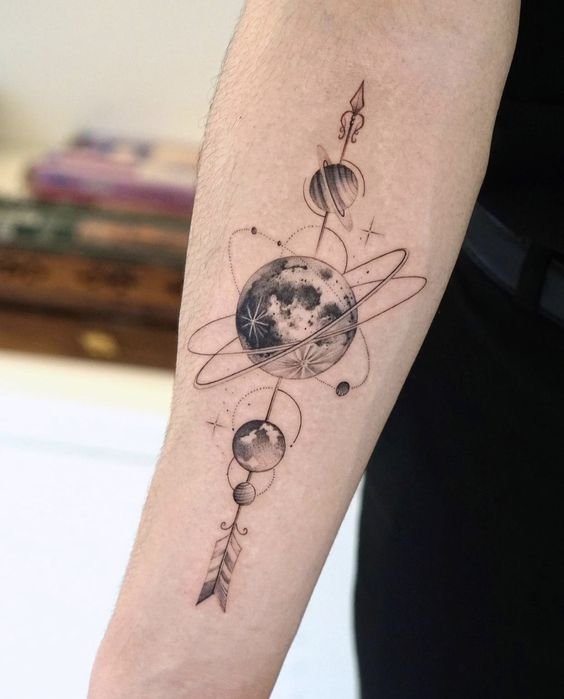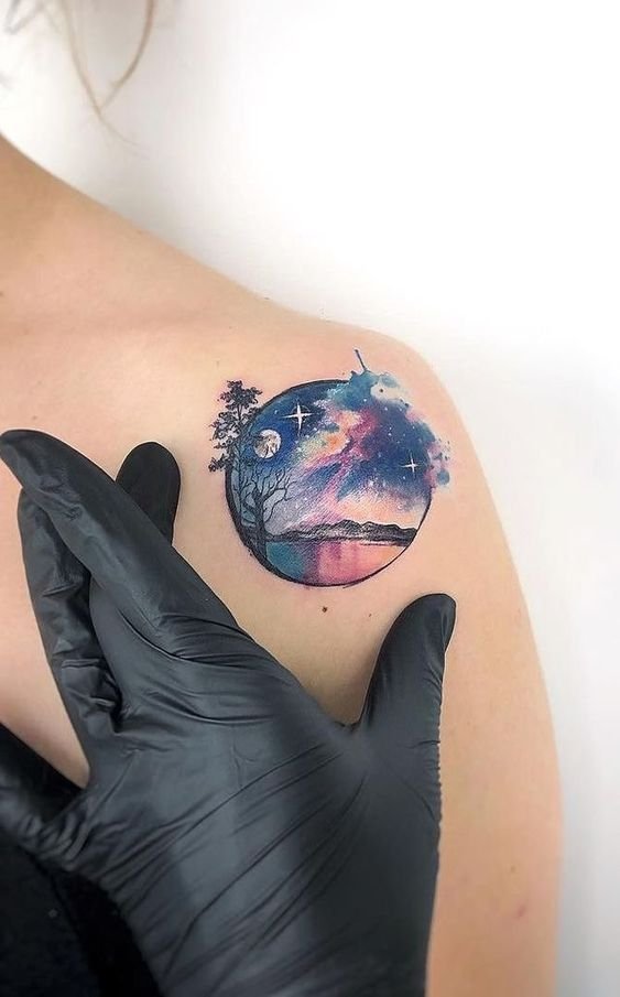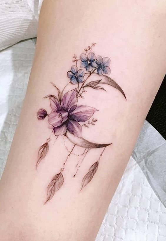 A moon surrounded by stars is a classic tattoo design symbolizing a connection with the cosmos and eternity. This design can be done in a minimalist style, with thin lines and dots, or in a more detailed manner with watercolor elements adding color and softness.