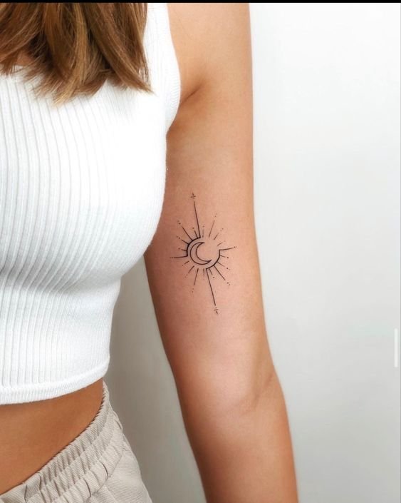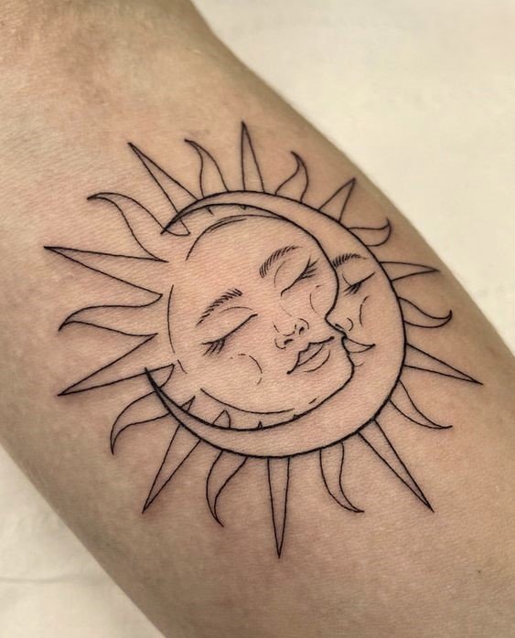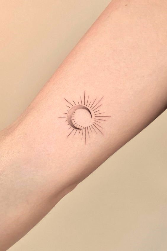 The crescent moon is a symbol of transition between beginning and end, the birth of something new. It is often associated with hope, dreams, and future plans. Minimalist crescent moon tattoos are popular for their simplicity and elegance. - Moon and Sun