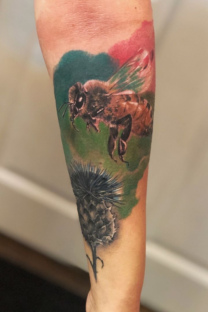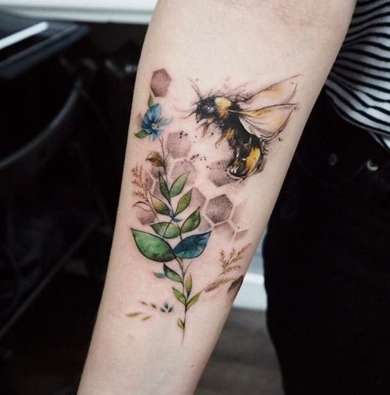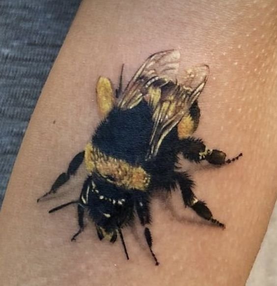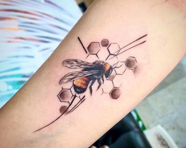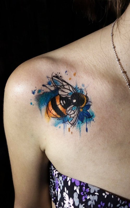 - Veelkleurige bijen tattoo's zien er spectaculair en indrukwekkend uit, aangezien de natuurlijke kleur ervan op zich al behoorlijk interessant is. En de combinatie van zwarte en gele kleuren zijn altijd een geslaagde keuze.
