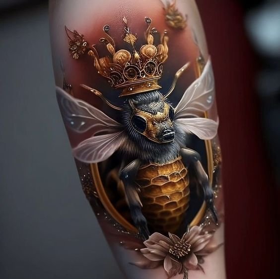 - De afbeelding van de bijenkoningin, de leider van de hele kolonie, is een krachtig beeld dat macht en grenzeloze vrouwelijke kracht vertegenwoordigt.