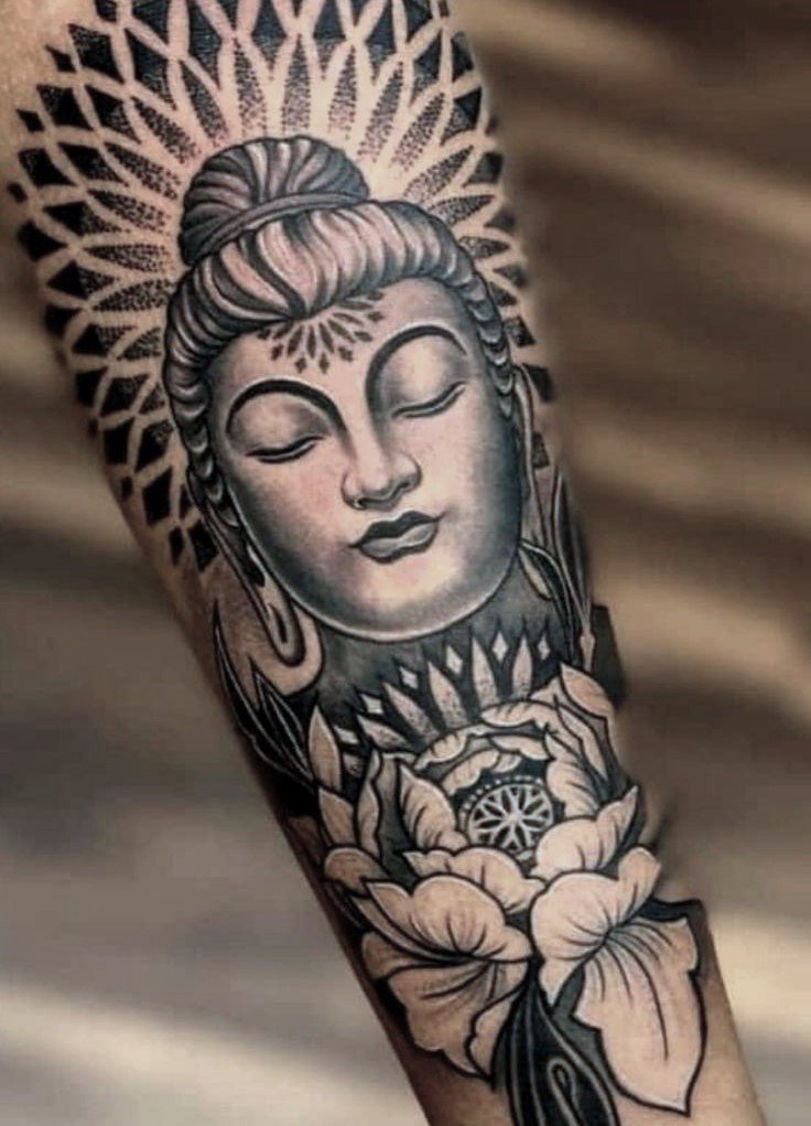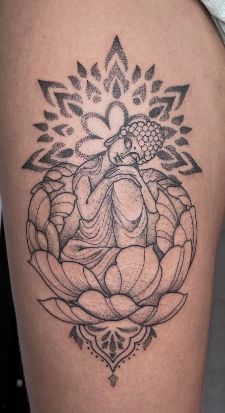 - Boeddha en mandala: De combinatie van Boeddha met een mandala creëert een complex en gedetailleerd ontwerp dat staat voor heelheid en eenheid. De mandala versterkt de spirituele betekenis van de tattoo door elementen van harmonie en balans toe te voegen.