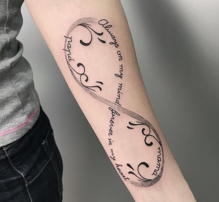 - Infinity met inscripties - bevat vaak datums, gebeurtenissen of namen, hoofdletters, die een gedenkwaardige herinnering in het leven zijn.