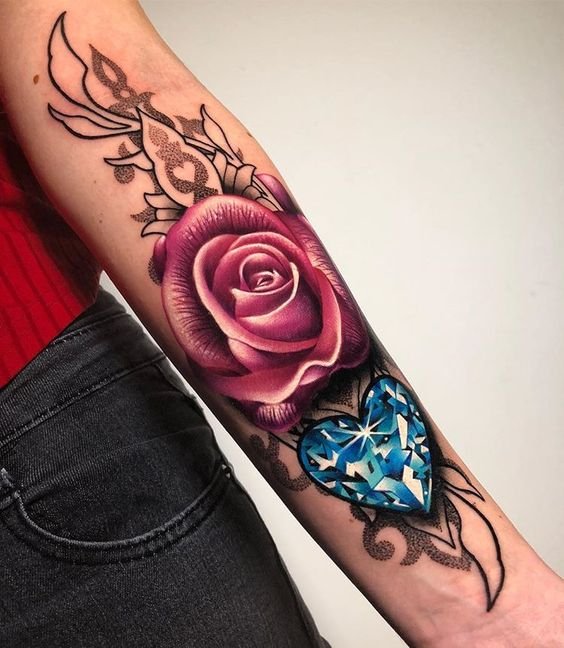 - Een tatoeage van een roos en een hart belichaamt het idee van onvoorwaardelijke liefde en passie. Deze combinatie kan diepe emotionele verbindingen, liefde, verlies of toewijding symboliseren. Het hart, afgebeeld samen met de roos, herinnert aan het belang van gevoelens en emotionele openheid, terwijl de roos aan dit beeld een element van schoonheid en verfijning toevoegt.