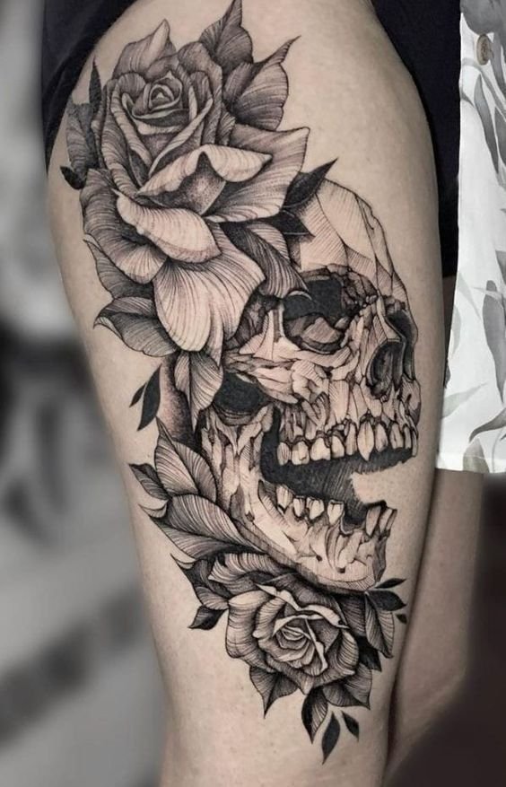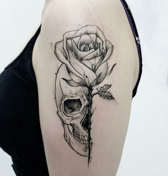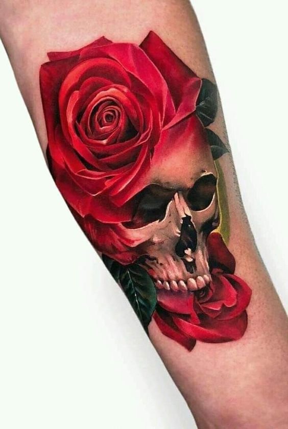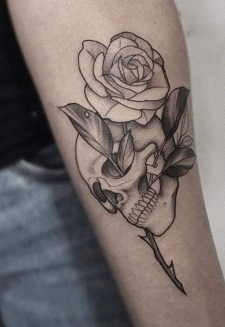 - Een tatoeage die een roos en een skelet combineert, kan somber lijken, maar symboliseert eigenlijk de cycli van leven en dood, een herinnering dat schoonheid zelfs op de meest onverwachte plaatsen kan bestaan. Het skelet, vaak geassocieerd met de dood, gecombineerd met de roos, het symbool van leven en wedergeboorte, biedt een diepe reflectie op de levenscycli en de eeuwige wedergeboorte.
