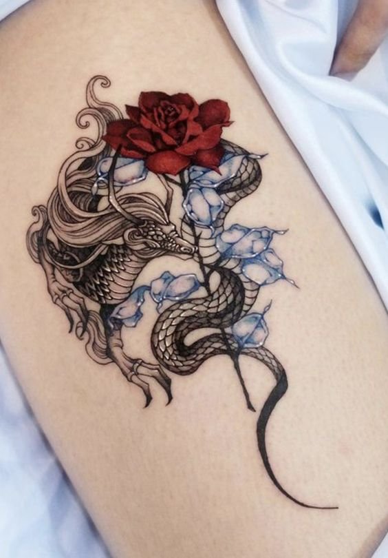 - De combinatie van tatoeage roos met een draak symboliseert de strijd tussen schoonheid en kracht, kwetsbaarheid en grootsheid. De draak, als een machtig en angstaanjagend symbool, vertegenwoordigt kracht, wijsheid en bescherming, terwijl de roos schoonheid, passie en liefde symboliseert. Samen creëren ze een uniek beeld dat het idee van tegenstand en harmonie belichaamt, de complexiteit van de menselijke natuur en de wereld als geheel benadrukkend.