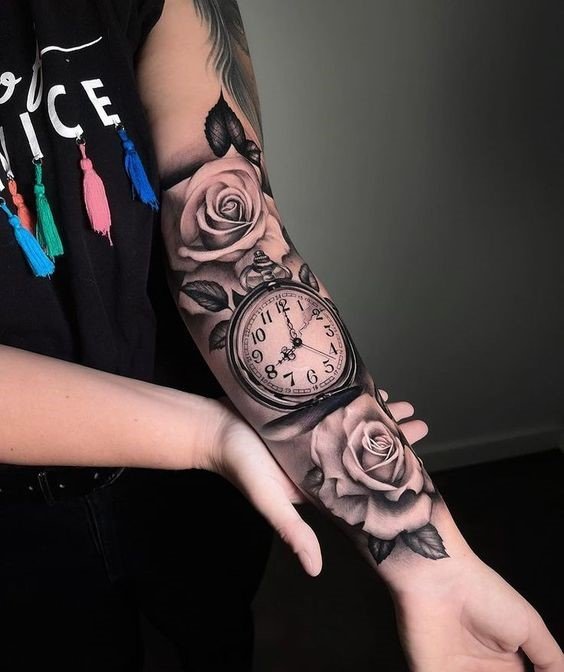 - Een tatoeage roos verweven met klokken is een krachtige herinnering aan de broosheid van het bestaan en de eeuwigheid van momenten. Klokken kunnen een specifiek moment in het leven symboliseren, een herinnering dat de tijd onverbiddelijk is, of ze kunnen respect voor het verleden en hoop voor de toekomst uitdrukken. In deze combinatie voegt de roos een element van schoonheid en wedergeboorte toe aan het beeld van de klokken, herinnerend dat zelfs de moeilijkste momenten in het leven groei en nieuwe beginnen kunnen brengen.