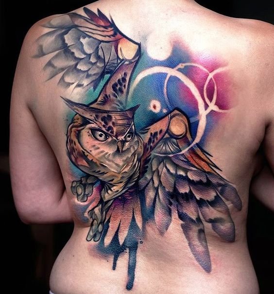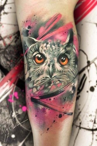- De aquarel techniek is een populaire optie voor het creëren van een ongewone en zelfs mystieke afbeelding van een uil. Aquarelverf kan de tattoo luchtigheid en lichtheid verschaffen, waardoor een mysterieus effect wordt gecreëerd.