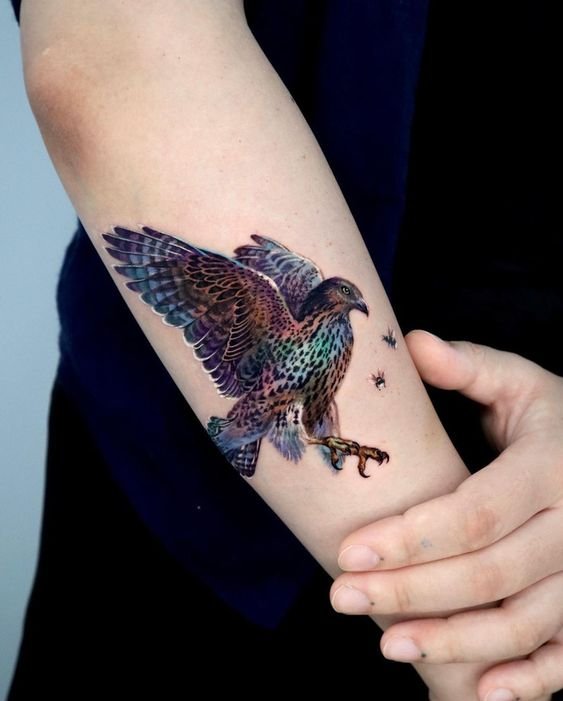 De lichaam tekening krijgt een individuele betekenis dankzij verschillende toevoegingen - voorwerpen, citaten. In het Oude Egypte is de vogel een symbool van vrijheid en spiritualiteit. De Oude Egyptische God van de hemel Horus met het hoofd van een valk was de beschermheilige van de farao's. Het beeld symboliseert bescherming en veiligheid, goddelijke leiding en instructie.