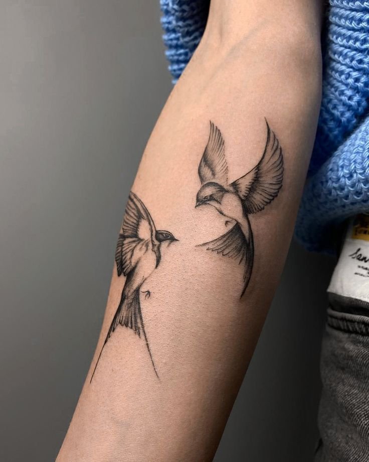 - Vogels die in paren of in groepen vliegen, symboliseren vaak liefde, gehechtheid en loyaliteit. Dit motief is geschikt voor degenen die belangrijke relaties in hun leven willen vereeuwigen. Duiven, zwaluwen en mussen zijn veelvoorkomende symbolen om familie- en vriendschapsbanden uit te drukken.